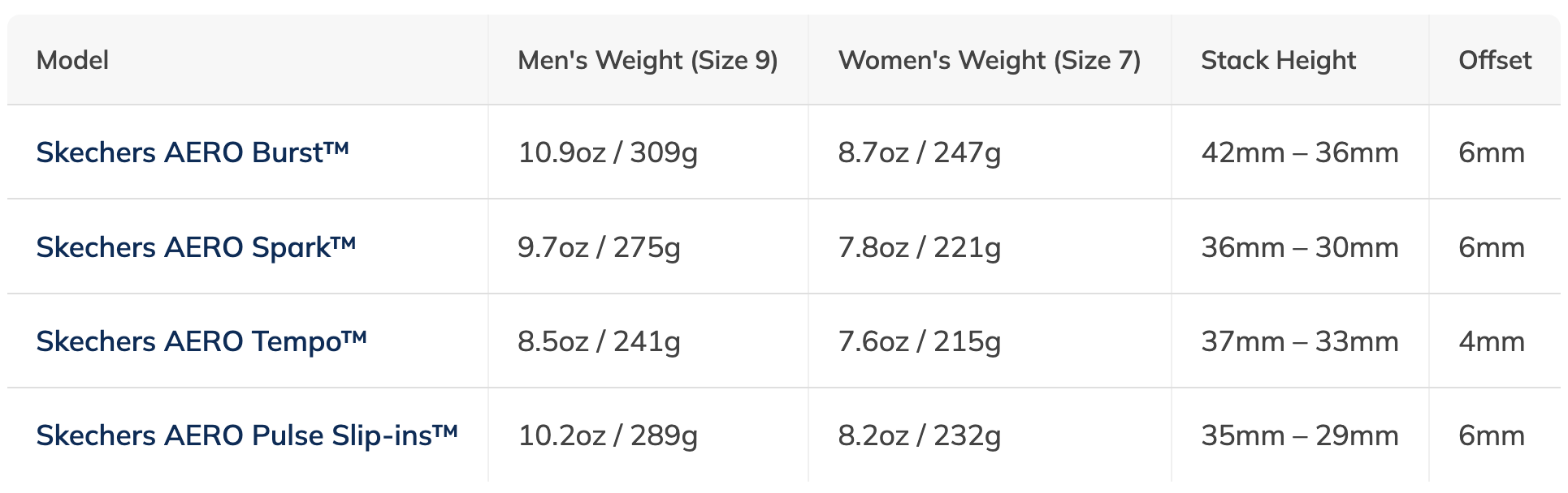 For those who love to dive into the details, here’s a quick comparison of the core specifications for each model in the Skechers AERO series: